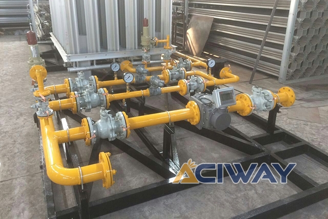调压计量撬,一种撬块式燃气调压计量装置,由矩形撬块、调节汇管、控制阀、计量管、流量计、调节阀、调节管、过滤器、出气管、进气汇管、进气口、出气汇管、排污管和安全放气阀组成,其特征在于进气汇管、出气汇管和调节汇管平行排列在矩形撬块上,且与矩形撬块横向平行,调节汇管在前,出气汇管在中,进气汇管在后,在进气汇管和调节管两端之间水平设有两条并联计量管,在每条计量管上逐序设有控制阀、过滤器、压力表、流量计和控制阀;在出气汇管和调节汇管中部之间水平设有两条并联调节管,在每条调节管上逐序设有控制阀、压力表、调节阀和控制阀;在出气汇管上中部设有带90°弯头的出气管,在进气汇管中侧部设有一个进气口;进气汇管和出气汇管上安装安全放气阀。